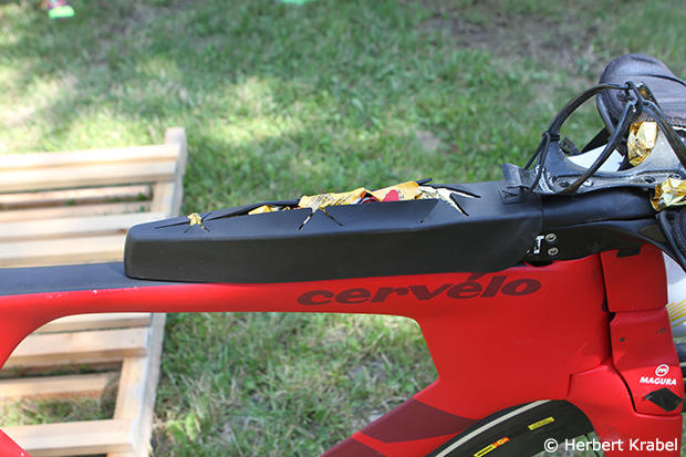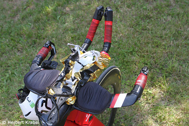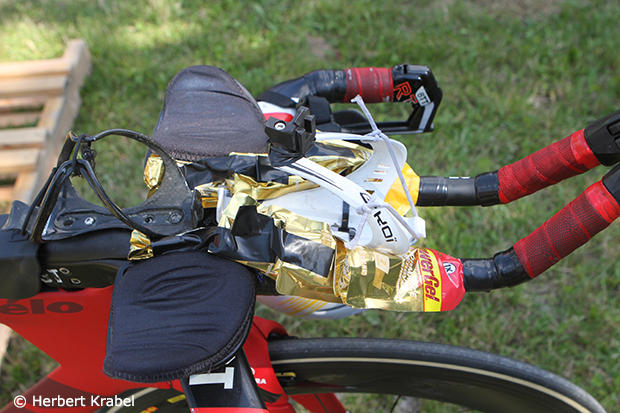 Butterfield taped additional Powerbar gels to the extensions of his 3T Aduro bars. You can see the 2 bottle cage set up well here.