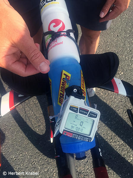 Butterfield had 2 bottles back to back between his arms, and mounted his SRM on top slightly sideways. But that does not bother him as he can see all needed data well.