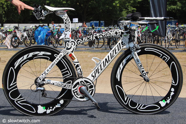 Evensen borrowed this 10 year old relatively deep rear wheel for IRONMAN Canada, and it worked out.