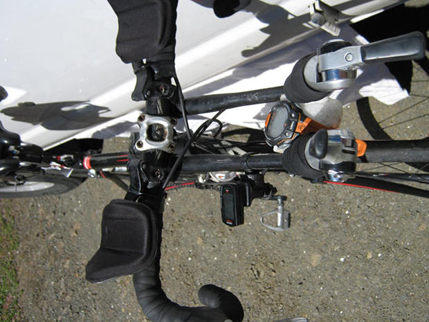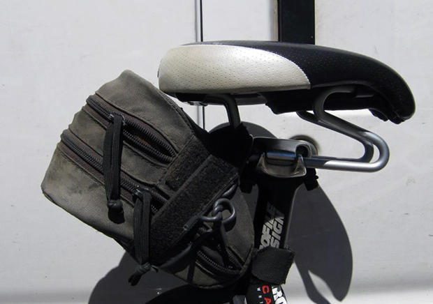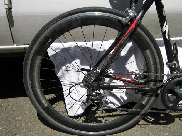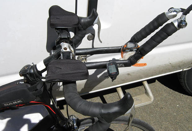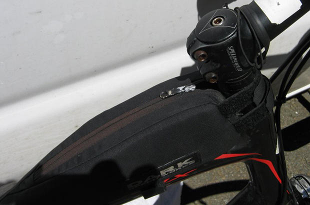 The tool bag under the saddle is reserved for various tools – a CO2 applicator, 4 threadless CO 2 cartridges, 3 tire levers, 3 tubes, 3 Allen wrenches, and a small tire sheath (in case of a blowout). Having flatted in 2000 at IRONMAN California, being able to fix it and still qualifying, Evensen likes to be prepared. Notice also thew forward Profile Design post.