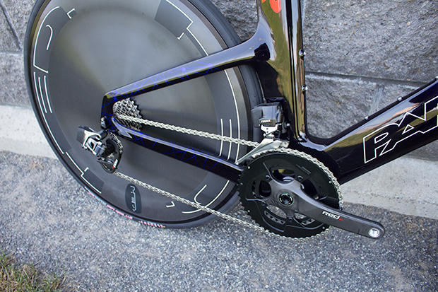 We managed to get pics of this new PARLEE TTiR super bike before it travels to various bike shows and gets likely drooled on. Notice also how nicely PARLEE shielded the discs for improved aerodynamics. The disc mounts are of the flat mount variety and the axles are 12mm front and rear.