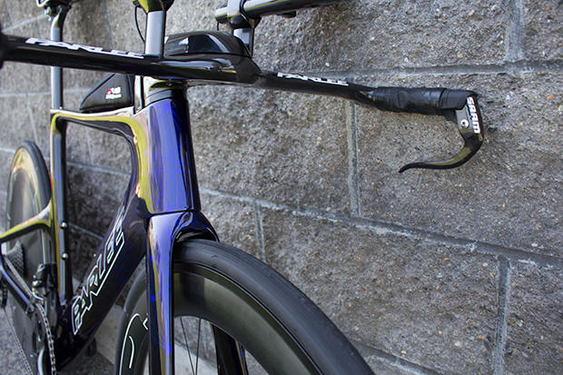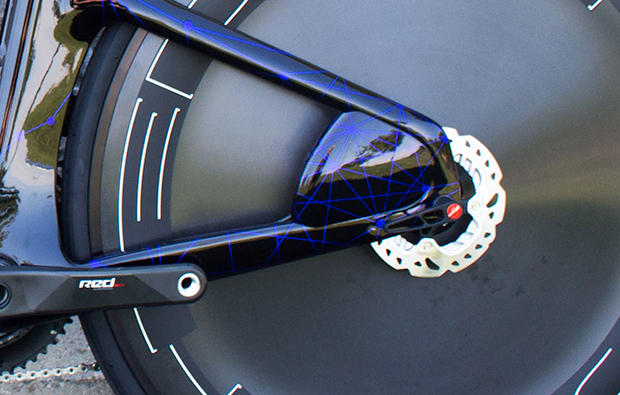 A closer look at the nicely pained disc aero shield of this show stopper triathlon bike.