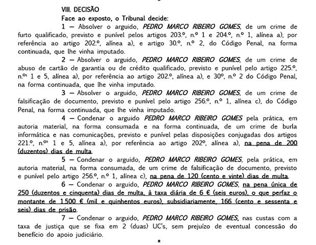 Pedro Gomes was not present when the verdict was announced. He was found guilty of intentional computer and wire fraud and intentional document falsification. Gomes was acquitted of the crime of on-going theft, the crime of on-going abuse of a credit card and the crime of on-going document falsification. He was subsequently sentenced to a 1,500 Euro fine or spend 166 days in prison. Gomes had repaid the victim, Sergio Costa, the money he had charged to his card before his trial.
