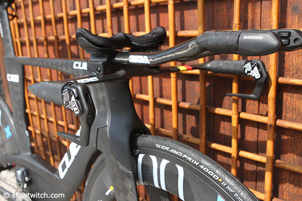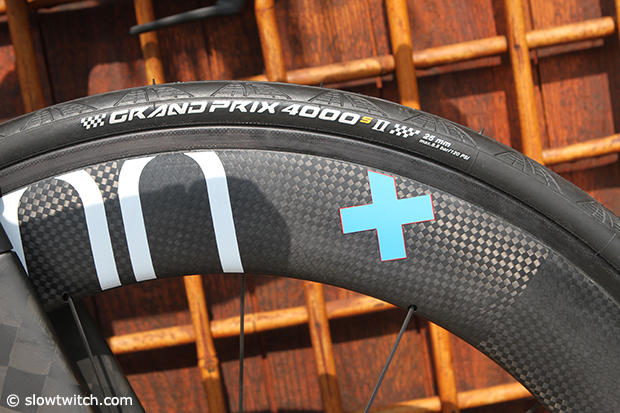 Raelert rides Swiss Side Haedron 800 carbon clinchers with 25mm Continental Grand Prix 4000 S II tires front and back.