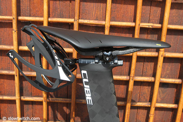 The Fizik Arione road saddle is attached to the aero post via a Ritchey 1-bolt system and features a behind the seat water bottle system.