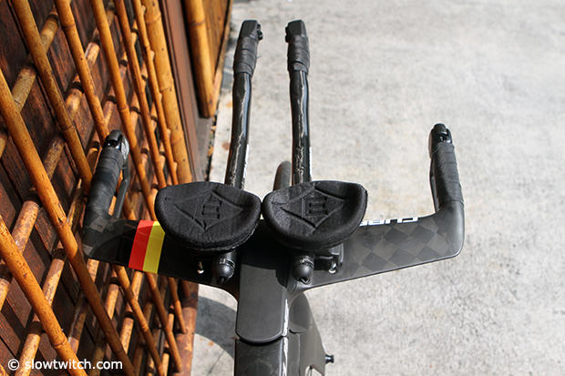 The German flag is very distinctive on this mostly black and white bike. The cockpit uses Profile Design extensions.