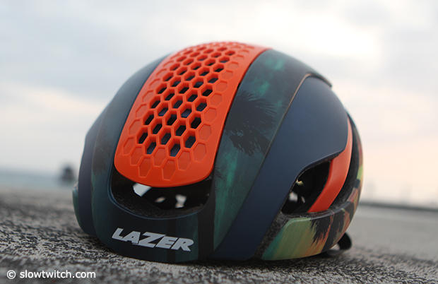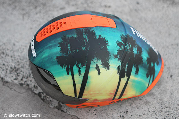Lazer brought a Wasp Air Triathlon model to Kona that coincidentally also featured a Hawaiian paint scheme. This helmet features a big vent in the center of the helmet.