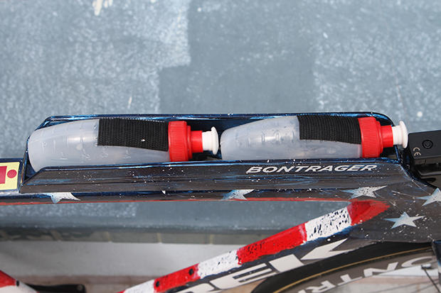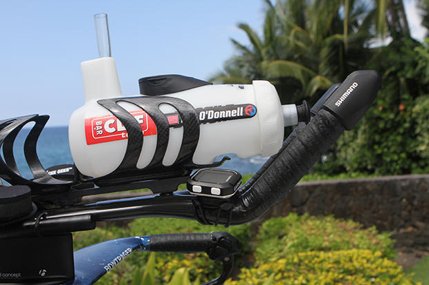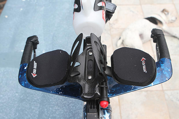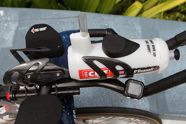 Timothy O'Donnell has two bottle cages between his arms and even found a cozy spot for the Garmin Edge 25 computer.
