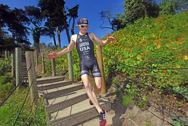 Eric Lagerstrom practices running down the steps near Fort Point two days before Escape From Alcatraz.