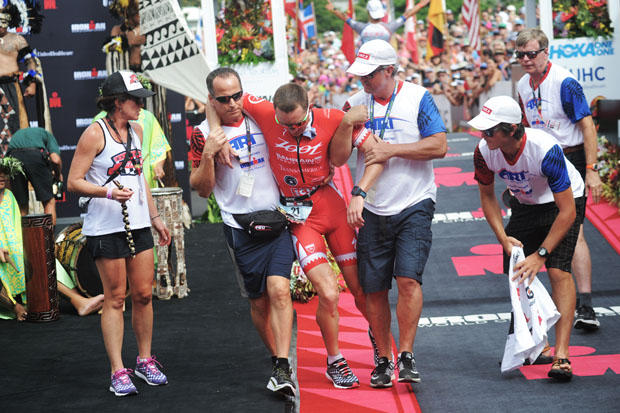 An exhausted Ben Hoffman of the U.S. is helped off the carpet after finishing 4th in 8:13:00 at Kona