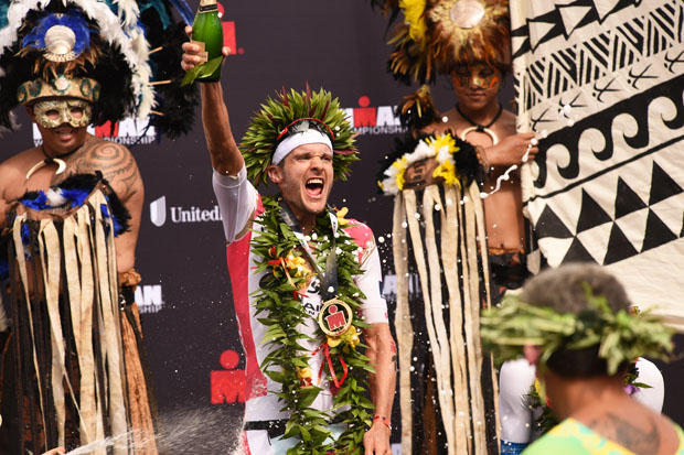 Jan Frodeno exults atop the Kona podium after a 3:32 margin of victory over fellow German Sebastian Kienle.