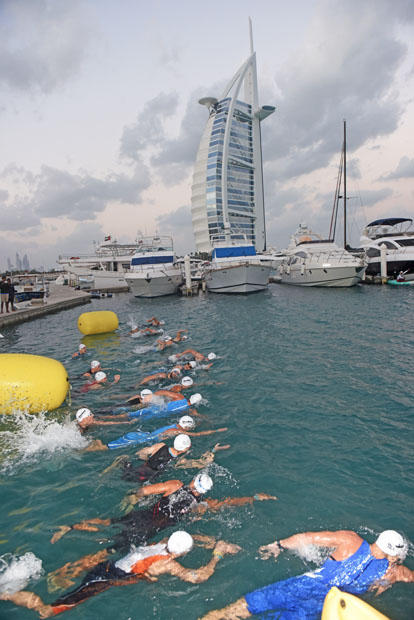 The Ironman 70.3 Dubai pro start was relocated to the protected waters of the Marina due to rough surf conditions.