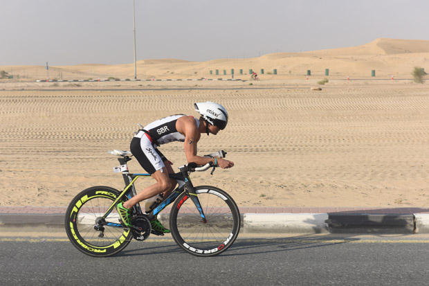 Miquel Blanchart Tinto of Spain rides through the desert on his way to an 8th-place finish in 3:49:54 at Ironman 70.3 Dubai.