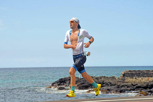 Patrick Lange of Germany looks like he is floating on air while running a 2:39:45 marathon – breaking Mark Allen’s 27-year-old run record split – on his way to 3rd place at Kona.
