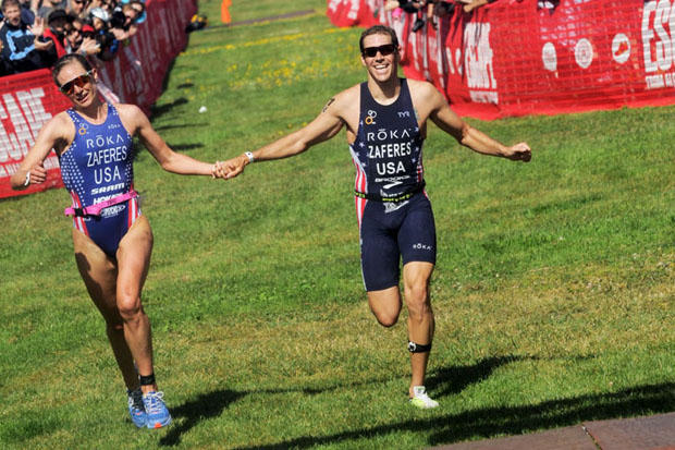 Tommy Zaferes and Katie Zaferes hold hands at the finish of Escape From Alcatraz on Marina Green.
