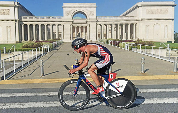 Ben Kanute of the U.S. rides past the Palace of the Legion of Honor on his way to a 3rd place finish at Escape From Alcatraz, 1:24 behind winner Joe Maloy.