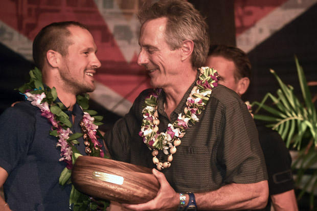 This trio represents 14 Kona wins – Dave Scott (6) and Mark Allen (6) greet an exhausted Jan Frodeno (2) at the finish line of the Ironman World Championship.