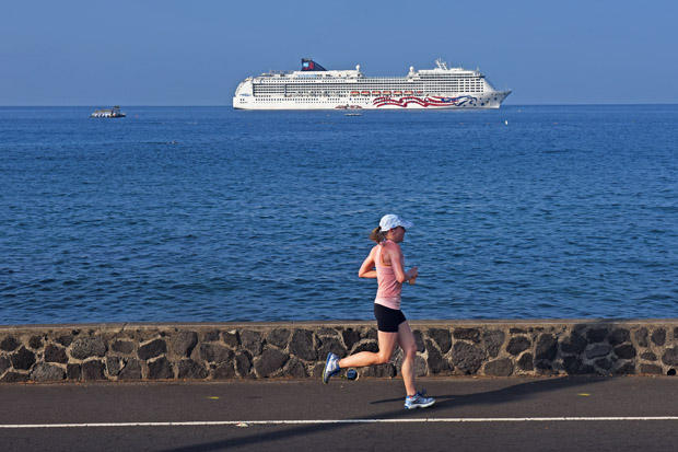 A lonely runner on Ali’i Drive passes in front of a cruise ship anchored in Kailua-Kona harbor.