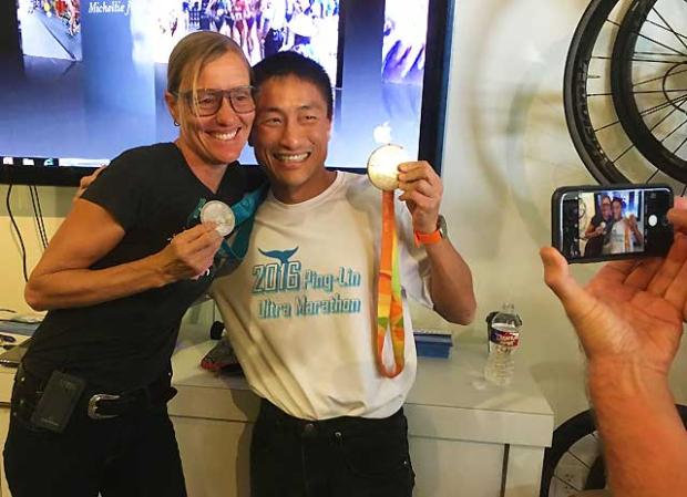 Michellie Jones spent the day at the Road Show in Dallas. She spoke to standing room only and then posed for pics. Here's a photo being taken of a photo being taken of Michellie and her two Olympic medals: a Silver for her performance in Sydney in the triathlon, and a Gold earned in Rio as a Paralympic partner.