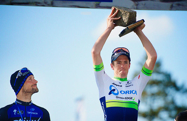 Hayman was in the early break of Paris-Roubaix, raced smart and stayed near the front all day. But after he collided with Ian Stannard in the famous Carrefour de L’Abre cobblestone section he lost contact with the leaders and it looked like his day was over. But it ain’t over until the fat lady sings and Hayman did not give up. The Aussie dug deep and clawed his way back to the leaders and in the end outsprinted the legendary Tom Boonen (Etixx-QuickStep), Ian Stannard (Team Sky), Sep Vanmarcke (LottoNL-Jumbo) and Edvald Boasson Hagen (Dimension Data) in the Velodrome for the coveted win and that unique cobblestone trophy.
