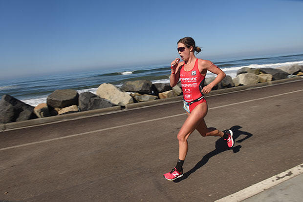 Holly Lawrence puffs on an inhaler on her way to a women’s 3rd-fastest 1:22:16 run split and victory.