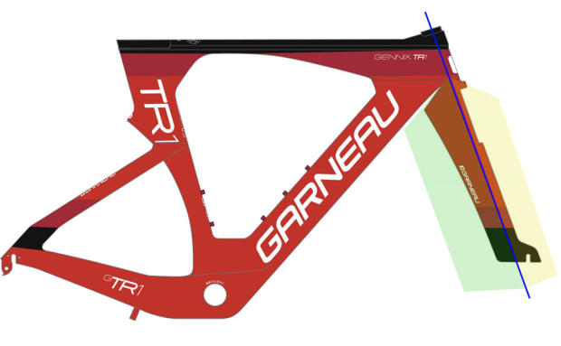 Let’s dispel a myth. Surface area doesn’t make a bike hard to handle. Surface area in front of the steering axis makes a bike hard to handle, if it’s a lot of surface area and if it’s especially windy. You’ll note from the diagram below that the Gennix is built with this in mind. For this reason Lionel Sanders and every other Gennix rider could, conceivably, ride a deeper front wheel and be subject to the same steering torque (the sensation of the wind pushing you around) as a rider who’s using a somewhat shallower front wheel.