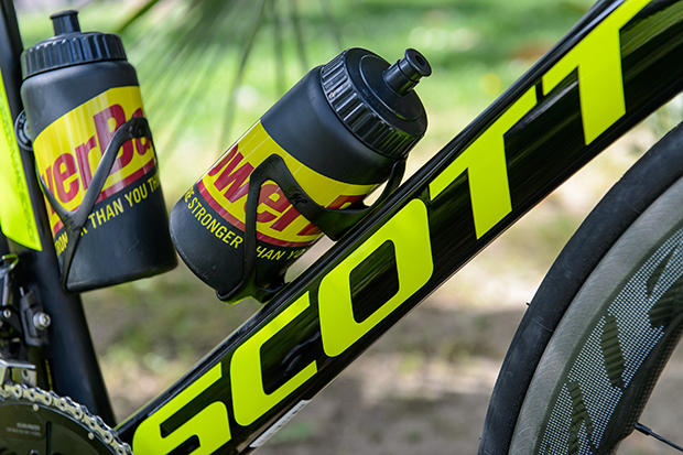 Typically Kienle has aero bottles on his road bike, but in a race like this with regular bottles he can easily dump one and receive a new one.