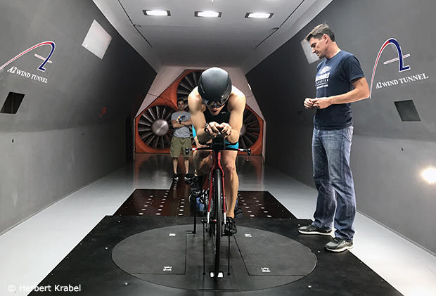 Geoff Eaker had to use his bag of tricks to mount the Cervelo P5X onto the wind tunnel stand. But Eaker will be better prepared next time as he knows that he will likely see more thru axle disc brake bikes coming his way.