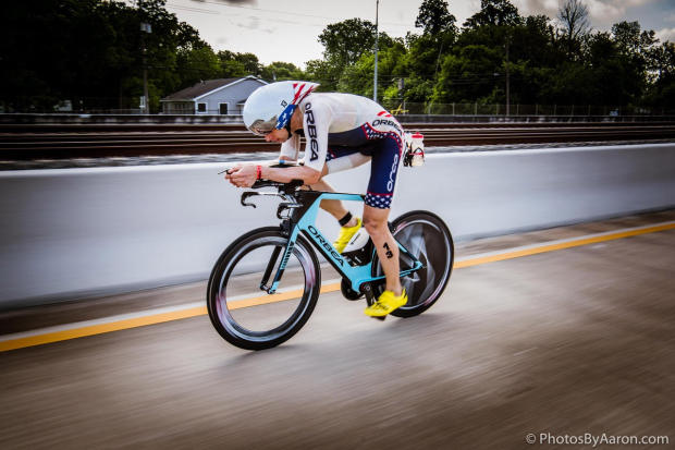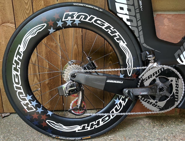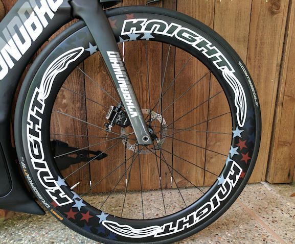 Front wheel is Knight's 65 disc clincher. Russell raced on Continental Grand Prix TT clincher tires (23mm) with latex tubes.