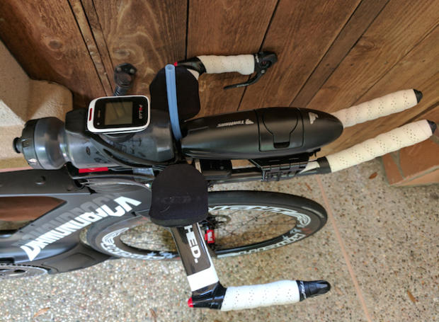 A side view of the cockpit including HED Corsair aerobars, TorHans AeroZ, a second BTA bottle, and a Polar M450 computer with plenty of room for it all.