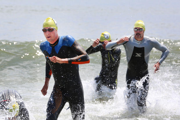 Dan Feeney (left) and John Rasmussen (right) enter the water in their HUUB Design suits. All four members of the teams complete the swim-bike-run course which is contained within one square mile for ease of spectating.