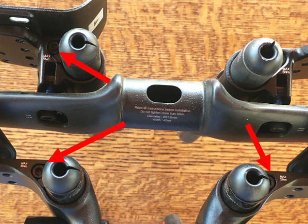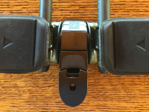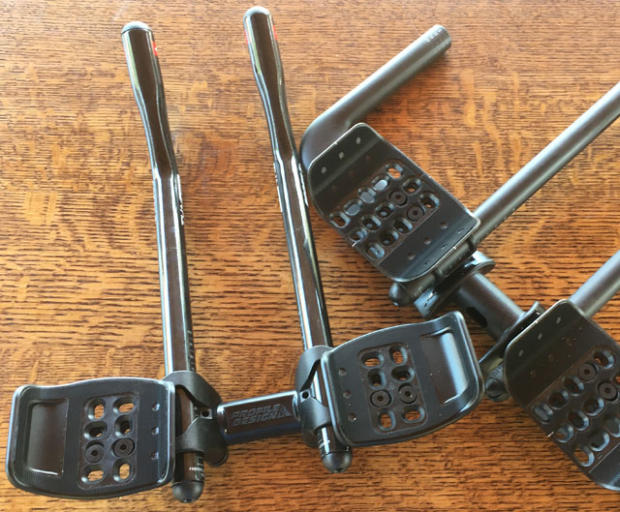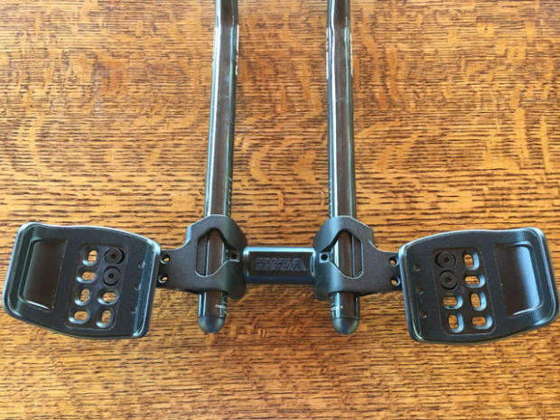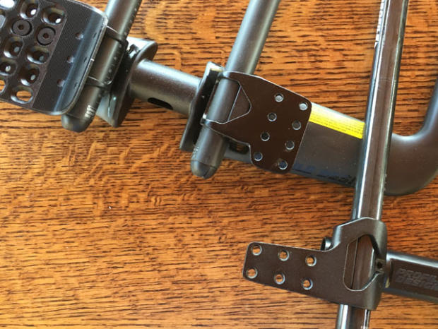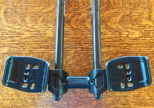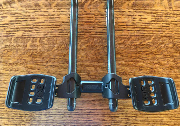 What if I swap the brackets? For this I simply took the extensions out and stuck them in backwards, and then swapped the cradles. Voila (below). Now I have a lot of forward pad adjustability, for those of you whose bikes are too small (lengthwise) and you need more cockpit distance. (If we can’t do this David will let us know.)