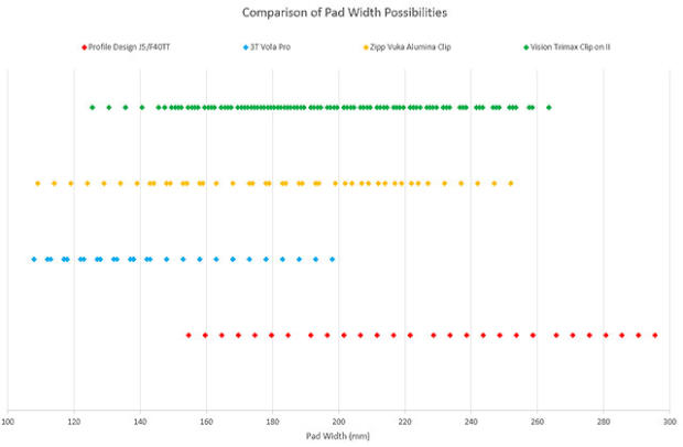 How does this compare to other aerobars out there? As noted I’m going to be reviewing the new Zipp aerobars separately and the chart below is not fair to Zipp because it as made based on its previous design. Also, my guess (I didn’t make this chart) is that the chart below does not contemplate Zipp’s pad extenders. What you can see is how wide this new PD bar goes and every data point below is a discrete place you can position the pad. If there are fewer data points, that means there are fewer positions in between the widest and narrowest position.