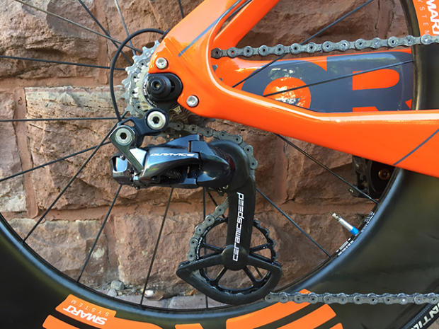 Timo Bracht rides Rotor Flow QRings with 53/42 rings and a 11-23 Shimano Dura-Ace cassette. The chain is a CeramicSpeed UFO and the pedals Exustar.