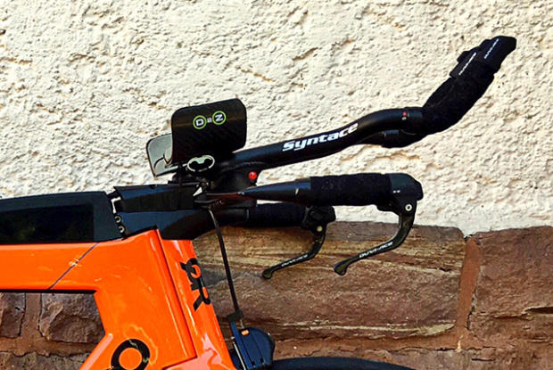 The Syntace front end is not very common in North America but it works well for Timo Bracht. He rides Syntace C3 extensions and Syntace Stratos base bars with Drag 2 Zero arm cups. For the race he added a BTA bottle.