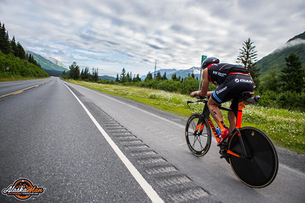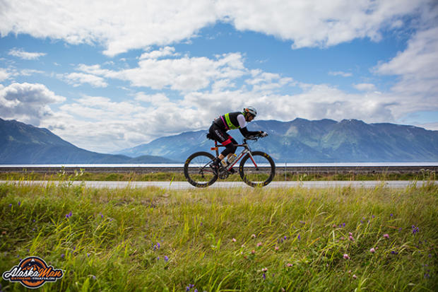 Jason Tillinghast, also from Utah, enjoys this flat stretch of the Alaskaman bike course.