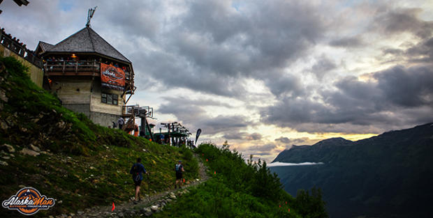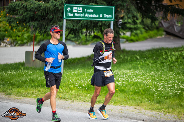 With "only 27.5 miles" of running ahead Zackary Dicks and two other athletes push towards the finish in Alyeska.