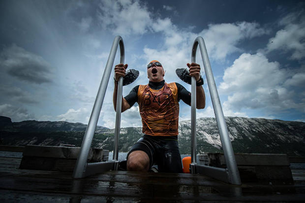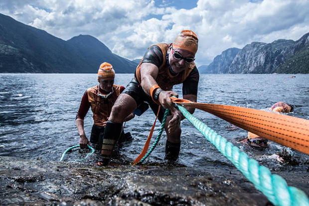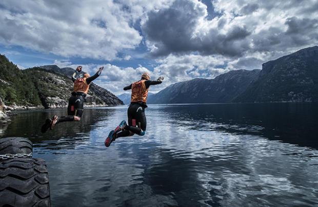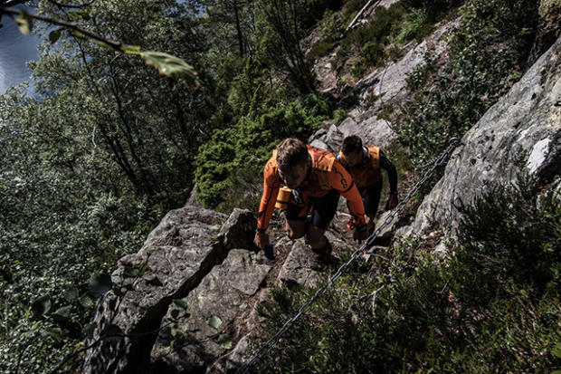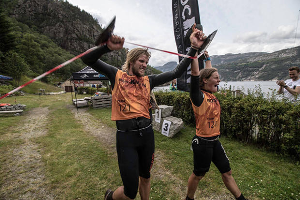 According to race director Thor Hesselberg the race attracted 77 teams but only 26 teams managed to avoid the cut-off and were able to pass the Dragon's Neck. The total race distance is 42km with 36km of running and 6km swimming. The swims comprise of 3 large fjord swims in 11-13 degree Celsius water and high mountain swims in even colder conditions. For the 36km of running athletes have to overcome 2,500 meters (8,202 feet) of elevation gain and close to 90% of the trails are very technical and challenging. There is also a 4444 step long wooden staircase that goes up 750 meters in elevation gain in a 1,500 meter stretch.