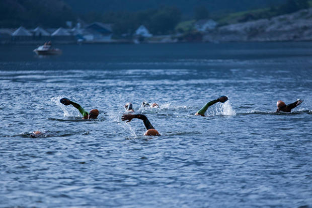 Swimming through a very cold fjord. Neoprene swim caps are certainly welcome here.