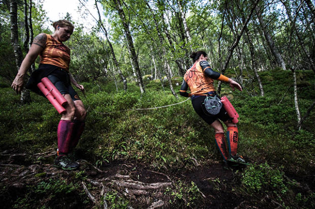 Tethered and ready for the next swim, but it is better to keep the eyes on the path ahead. Annelie Ståhl and Paula Kirkegaard on the way to 4th place in the female division.