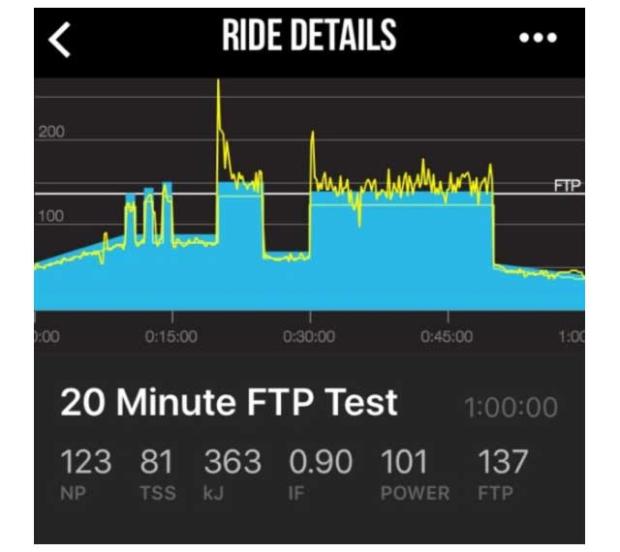 Now for the hard part, the Power Test. There are two options: an 8-minute test, and a 20-minute test. Both determine your functional threshold power (FTP), which as you all know is a good approximation for the maximum power you can sustain for one hour. I was advised to do the longer test. I made sure I was well rested so that I could get an optimal reading. Result: 137. Above is my 20-minute FTP Test Results from April 6, 2017.