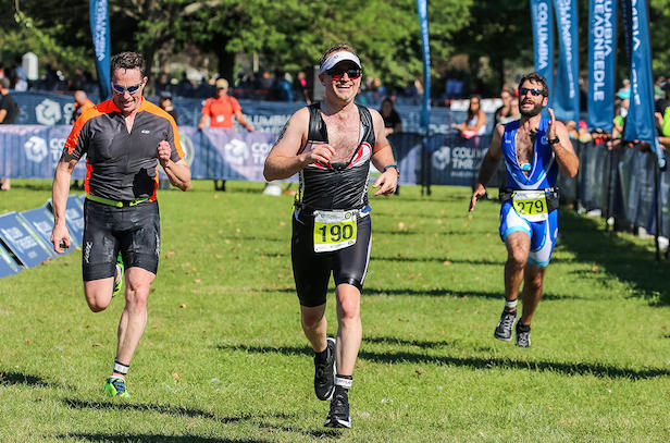 Just one week following a fifth place at IRONMAN Lake Placid, Lucas Pozzetta (middle) won in Boston for the second straight year. He narrowly beat Spencer Ralston (left) and Matt Alford (right).