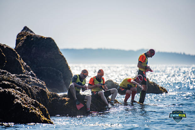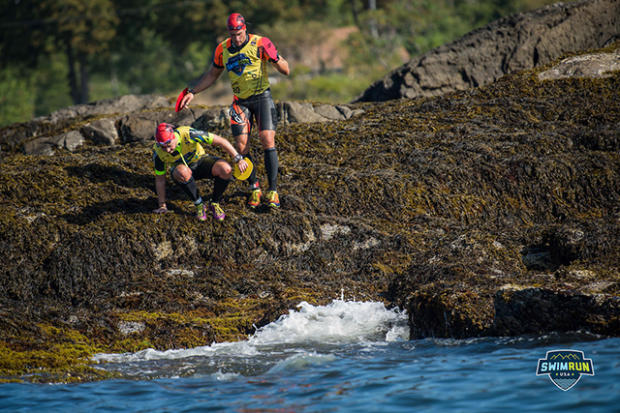 Some of the water entrances and exits are challenging even for experienced SwimRun athletes. Here a team scrambles cautiously into the water.