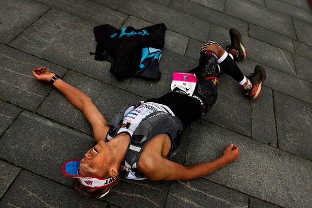 Race winner Allan Hovda completely spent on the ground after finishing the race in 12:03:19.