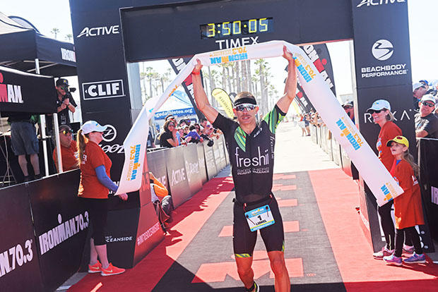 On his way to a race-best 1:45:34 split for the 30 kilometer run leg, Sanders passed Amberger for the lead in the final 10km and finished in 5:20:36 with a 1:33 margin of victory over the Australian (1:53:23 run split) and 5:47 ahead of 3rd-place Joe Gambles (1:50:14 run).