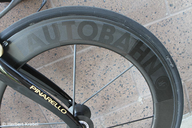 A German Lightweight Autobahn rear disc with German 25mm Continental Competition tires laced to both the rear and front wheel.