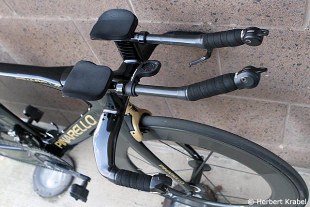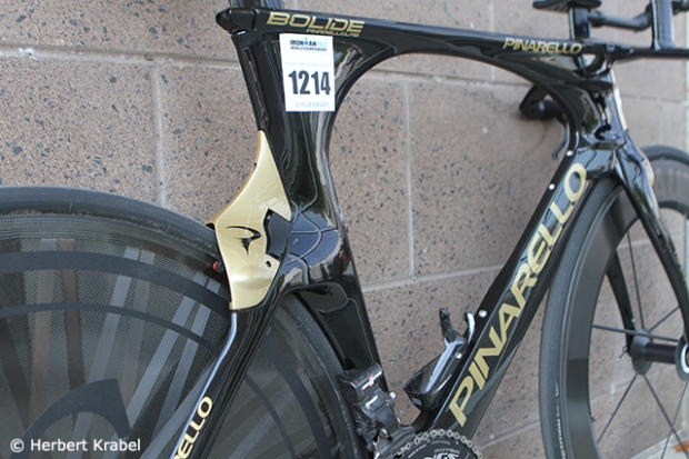 While in Chattanooga for the IRONMAN 70.3 World Championships we stumbled upon this distinctive black and gold Pinarello Bolide of Chilean M40-44 age grouper Hugo Eduardo Abarzua Vergara, and I took a closer look at this fairly rare bike on the triathlon circuit. I grabbed the pics before the race, but Vergara rode 2:30:14 and finished the race in 4:49:02 and 69th place in his age group. But what bike split he would do was not important in my decision to feature this bike, and I am not even known as a particular fan boy of this brand. But hey, this was the first time I saw one in the wild.