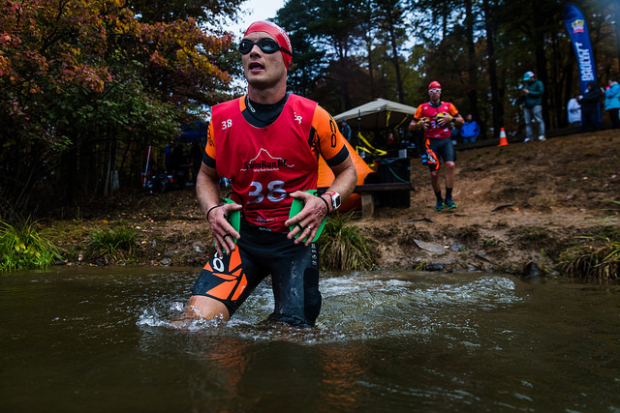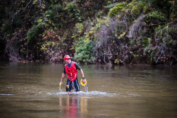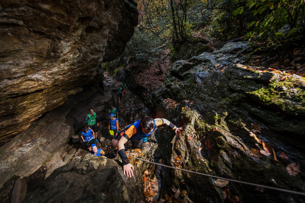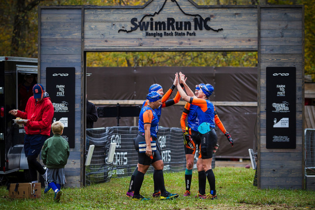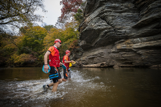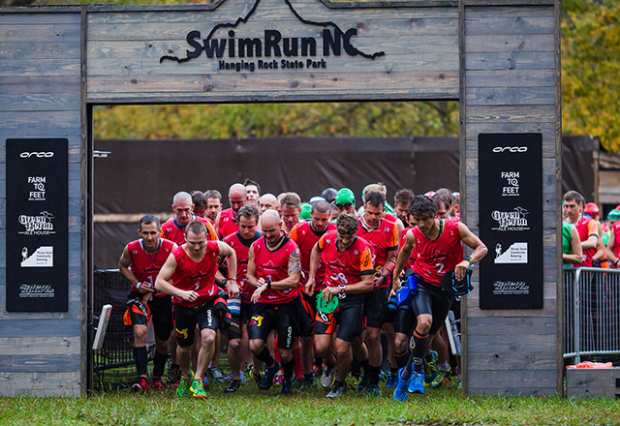 One of the last big SwimRun events of the 2017 season took place in cold and rainy conditions at Hanging Rock State Park in North Carolina, and 90 teams from all across North America made it to the start. The water temperature was around 57 degrees both in Hanging Rock Lake and the Dan River and the air temperatures steadily dropped from about 55 degrees at the start to 45 degrees by mid day, and it was well cooler on top of the mountain. Athletes tackled 14.3 miles of running with over 2000 feet of elevation gain and drop, and 3km of swimming spread out over 10 runs and 9 swims. 83 teams finished in these tough conditions and here are some pics from this sold out second year event that also serves as an ÖTILLÖ merit race.