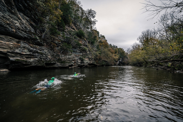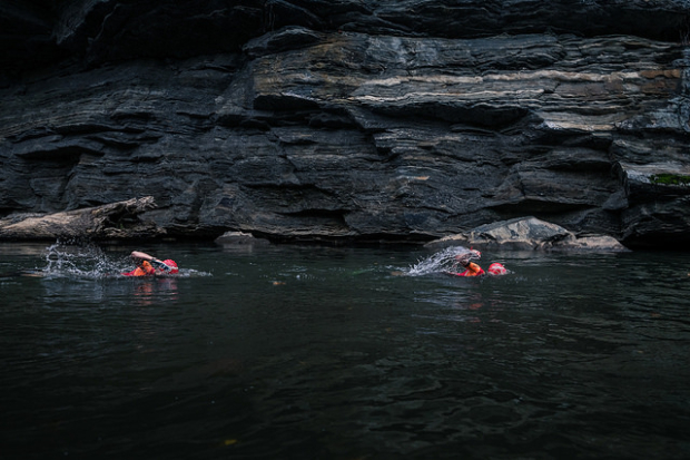 When confronted with impressive elements of nature even racers will sometimes stop to take it all in. The final swim of the SwimRun NC starts right next to a massive rock formation.