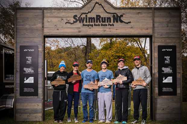 The champions in each division are lined up here. From left to right, female champions Kristen Smith Jeno and Jenny Ledford, male champions Marcus Barton and Caleb Baity and Amy Krakauer and Marcus Carson who grabbed the mixed title in 3:45:16.